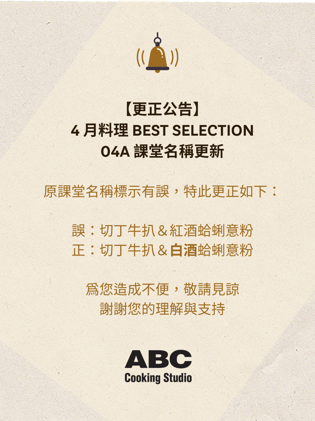【更正公告】 4 月料理 Best Selection 04A 課堂名稱更新